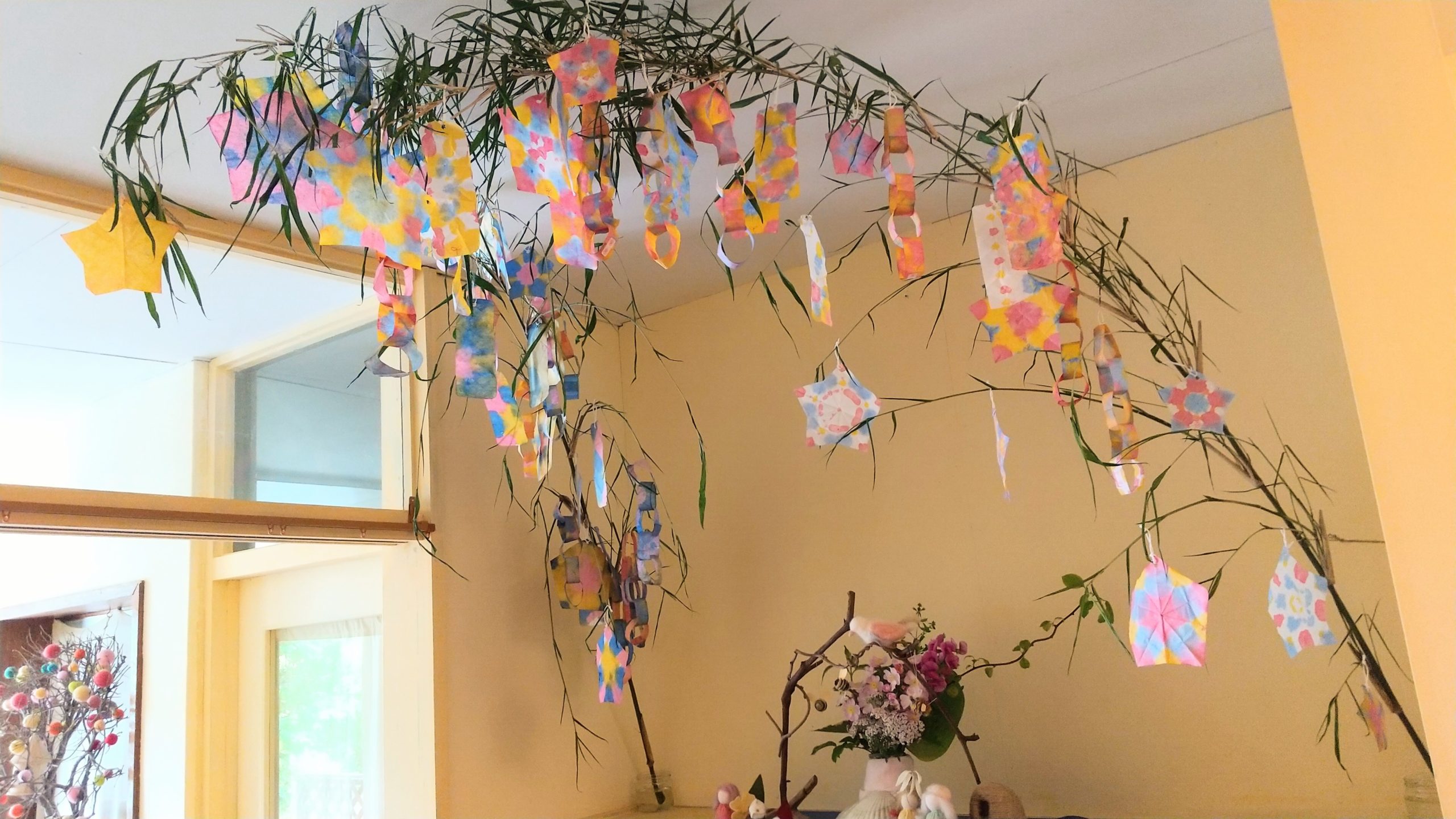 皆で野花を持ち寄り、花の冠を作り、この季節の植物の芽吹いていく喜びに感謝するお祝いです。園の室内には、テーブルや手洗い場、廊下など子どもたちの過ごす空間に、庭先の季節の花を摘んできて飾っています。花の周りには、季節を表す動物や貝殻なども飾り、自然界に息づいているものをしつらえ、子どもたちはそれらをより身近に感じていきます。